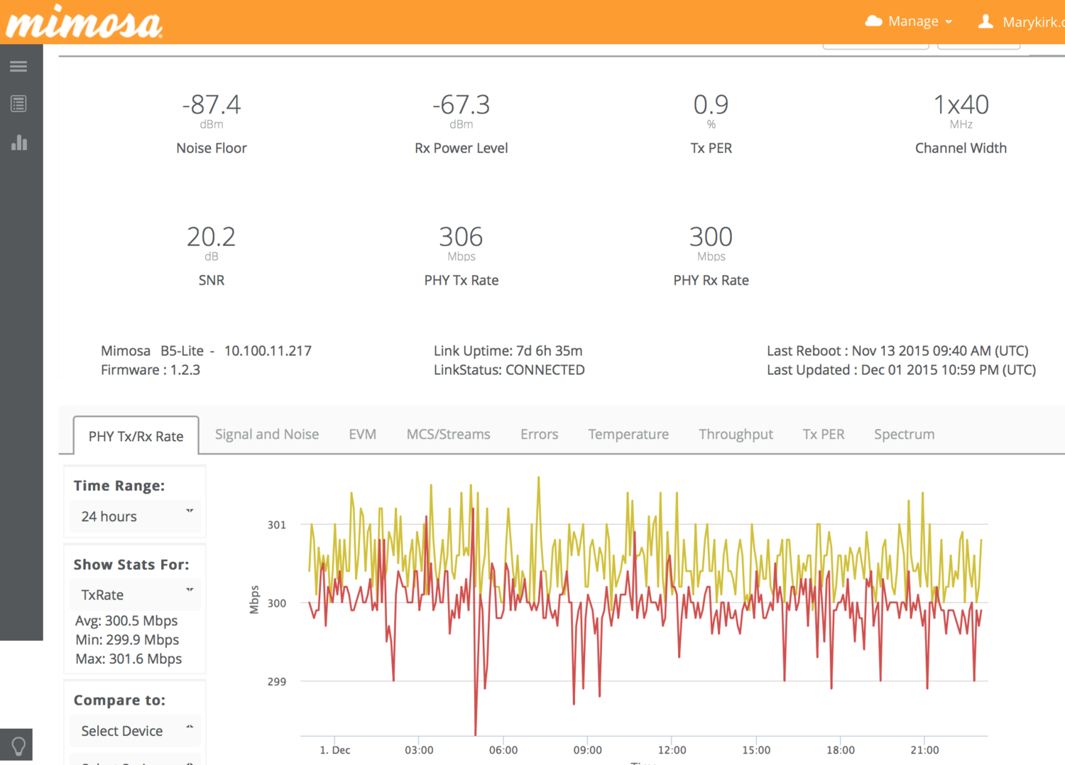 The Mimosa B5-Lite links are very stable, according to Bill. They have measured between 299 Mbps and 301 Mbps of actual transmission performance and have been stable for weeks on end.